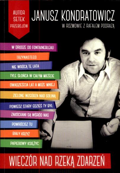 Janusz Kondratowicz – poeta polskiej piosenki, autor ponad siedmiuset piosenek, z czego prawie dwieście stało się przebojami, tworząc dziś kanon polskiej muzyki rozrywkowej. Autor między innymi takich hitów jak: „Tyle słońca w całym mieście”, „Powrócisz tu”, „Biały Krzyż”, „Zaopiekuj się mną”, „Powiedz stary gdzieś ty był”, „Jaka jesteś Mario” czy „W drodze do Fontainebleau”. W bardzo szczerej, momentami zaskakującej rozmowie z Rafałem Podrazą zdradza tajemnice polskiego show biznesu. Dlaczego Irena Jarocka nie zrobiła światowej kariery? Jak naprawdę wyglądały relacje małżeńskie Anny Jantar i Jarosława Kukulskiego? Co było powodem wyrzucenia Krzysztofa Klenczona z Czerwonych Gitar? W czym Urszula Sipińska była lepsza od Maryli Rodowicz? I w końcu dlaczego Władysław Szpilman nie lubił Wiery Gran? Te i wiele innych pytań nie pozostało bez odpowiedzi. „Wieczór nad rzeką zdarzeń” – to swoisty artystyczny testament zmarłego 2 lipca 2014 roku wybitnego autora tekstów i poety. [lubimyczytac.pl]
