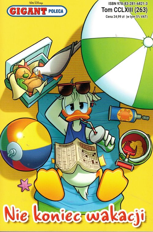 Połowa Kaczogrodu jest na letnich wakacjach i cieszy się słońcem na plaży. Niektórzy szukają relaksu, Dziobas szuka plastikowych odpadów, Donald szuka piszczących kaczek... a my szukamy kolejnych śmiesznych przygód ulubionych bohaterów komiksów Gigant Poleca! (Nota wydawcy).