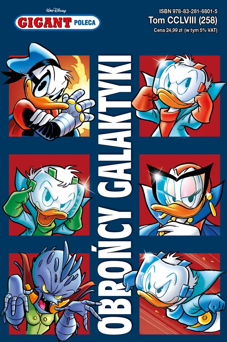 Superkwęk i Superkwoczka mają pełne ręce roboty z... robotami, które zaatakowały Kaczogród. Ale źródło zła leży w bezkresnym kosmosie. Podczas gdy niektórzy bohaterowie walczą na Ziemi, Superchłopcy biorą się za bary z międzygalaktycznym zagrożeniem. Przedstawmy tę trójkę jeszcze raz... Gigant Poleca” to największa seria komiksowa, jaka ukazała się w Polsce – wszystkie wydane historyjki liczą ponad 60 tysięcy stron! „Gigant Poleca” bawi polskich czytelników już od 1992 r., kiedy był wydawany jako „Komiks Gigant”. Każdy tom zawiera 256 stron prześmiesznych historii z przygodami znanych i lubianych postaci, takich jak Kaczor Donald wraz z siostrzeńcami, Sknerus McKwacz, Myszka Miki pełniący rolę sprytnego detektywa, jego przyjaciel Goofy wcielający się czasem w rolę archeologa-podróżnika Indiany Goofsa, zwariowany wynalazca Diodak, nieobliczalny Dziobas, niezwykły szczęściarz Goguś, leń i obżartuch Gęgul i wiele, wiele innych. Znakiem rozpoznawczym serii „Gigant Poleca” jest wielka przygoda: poszukiwanie skarbów, dalekie wyprawy, a także pułapki i niebezpieczeństwa, z których nasi bohaterowie wychodzą obronną ręką (zazwyczaj). Nowe tomy dostępne są co dwa miesiące w punktach sprzedaży na terenie całego kraju oraz w prenumeracie. [www.azymut.pl, 2025]